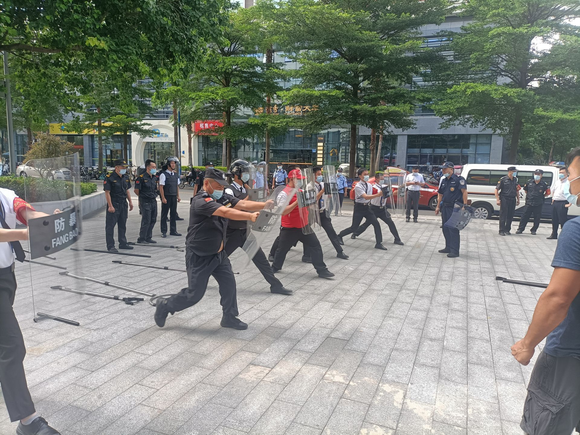 随后开展了多次反恐应急实战演练,参训保安队员从实战中掌握盾牌、钢叉、长棍、防刺服等装备的使用技巧,有效地提高了自身的反恐应急能力。